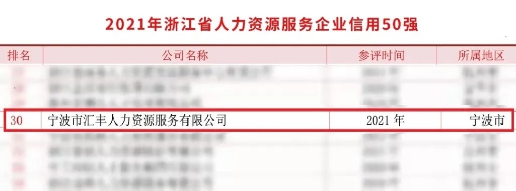 昨日,2021年《浙江省人力资源服务企业信用等级评定前50强排名》新鲜出炉,宁波市汇丰人力资源服务有限公司(以下简称“汇丰人力”)成功登榜!据悉,汇丰人力就已经出现在这份榜单上,本次登榜也是汇丰人力近两年积极发展的体现。2021年度信用等级评定由省人力资源服务协会组织,依据历年(2019~2021年)所有参与审计版评定,等级在有效期内的入库人力资源服务企业的综合得分,取前50位,按分值高低进行排序。本次评定的综合得分表,由5个维度、23项指标组成的模型计算得出,能够上榜,充分展现了汇丰人力不凡的综合实力。一直以来,汇丰人力致力于公司诚信文化建设,秉承着“诚信、务实、创新、仁义”的服务理念,汇丰人力不断地探索和追求,打造优秀的企业品牌形象。今后我们将再接再厉,以此为契机,继续加强企业诚信守约,依法经营的服务理念,发挥汇丰人力示范引领和辐射带动作用,努力为行业信用体系建设的健康发展做出贡献。