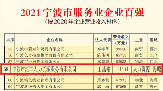 2021年8月31日,宁波市企业联合会、工业经济联合会、企业家协会联合公布了号称宁波企业的“福布斯”榜的市百强企业榜单,本次,宁波市汇丰人力资源服务有限公司(以下简称“汇丰人力”)荣登2021宁波市服务业企业百强,及宁波市企业管理现代化创新成果两大榜!,喜报一在“2021宁波市企业百强” 榜单中,汇丰人力荣登市服务业百强第58位,位列人力资源行业榜首! 自2016年来,汇丰人力已连续6年蝉联此榜单!汇丰人力奋力拼搏,争做人力资源企业领头羊,本次获奖也展现了汇丰人力雄厚的品牌实力和锐不可当的发展趋势。 喜报二同期发布的荣誉中,汇丰人力还凭借着智慧人力云管理体系获得了宁波市企业管理现代化创新成果三等奖的优越成绩,也是本次唯一获奖的人力资源公司。创新是企业发展的不竭动力,汇丰人力始终牢记于心,实践于行,不断创新,砥砺前行。身披荣耀与责任,未来的汇丰人力将继续不忘初心,深耕市场,做优做强我们的品牌,用专业体现价值,用服务引领发展,用实际行动践行汇丰精神,为行业新风貌新发展做出贡献。 关于汇丰宁波市汇丰人力资源服务有限公司成立于1993年,是一家集服务外包、车辆租赁运输、劳务派遣、灵活用工、人事代理、人才猎聘、招聘外包、职...